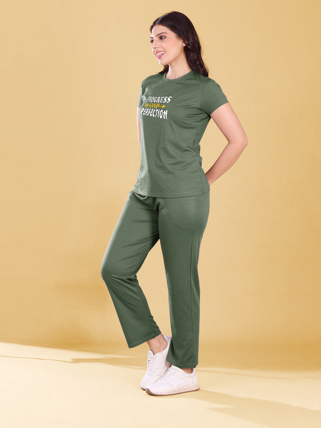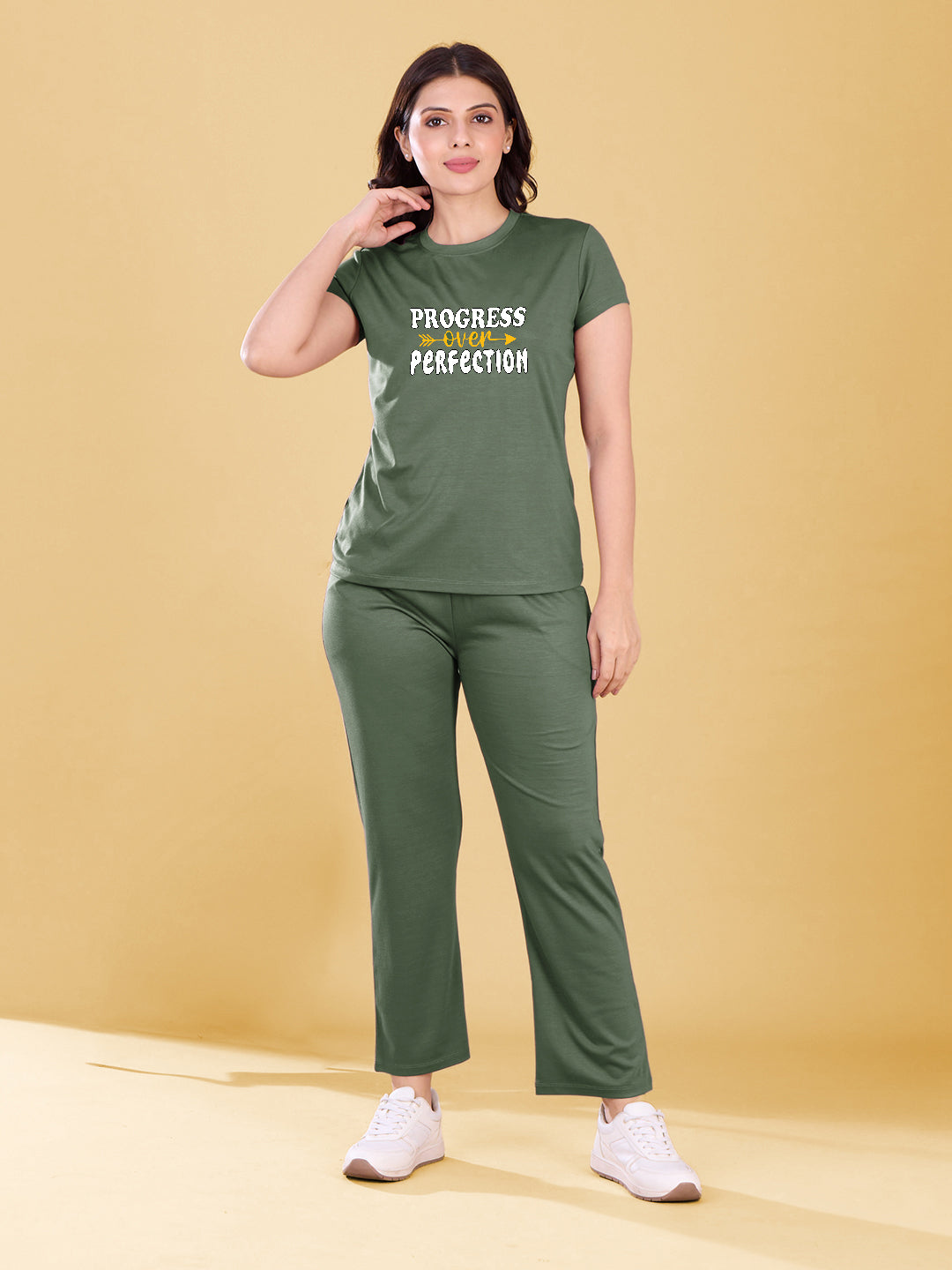 Includes stylish printed T-shirt and mid-rise flare pants for a trendy co-ord look