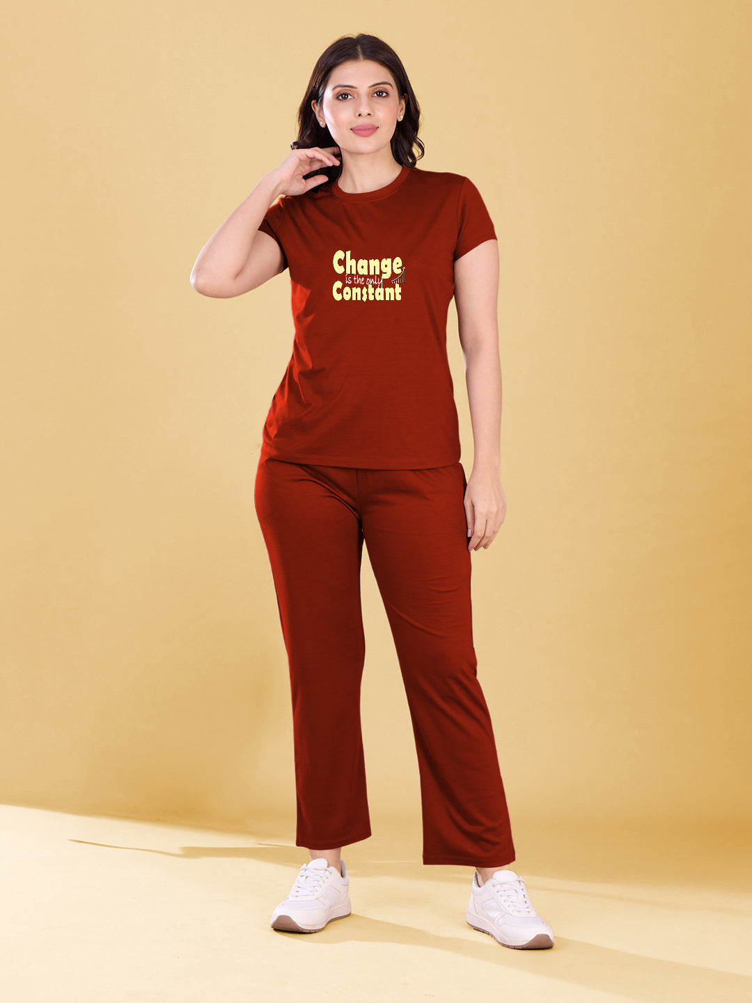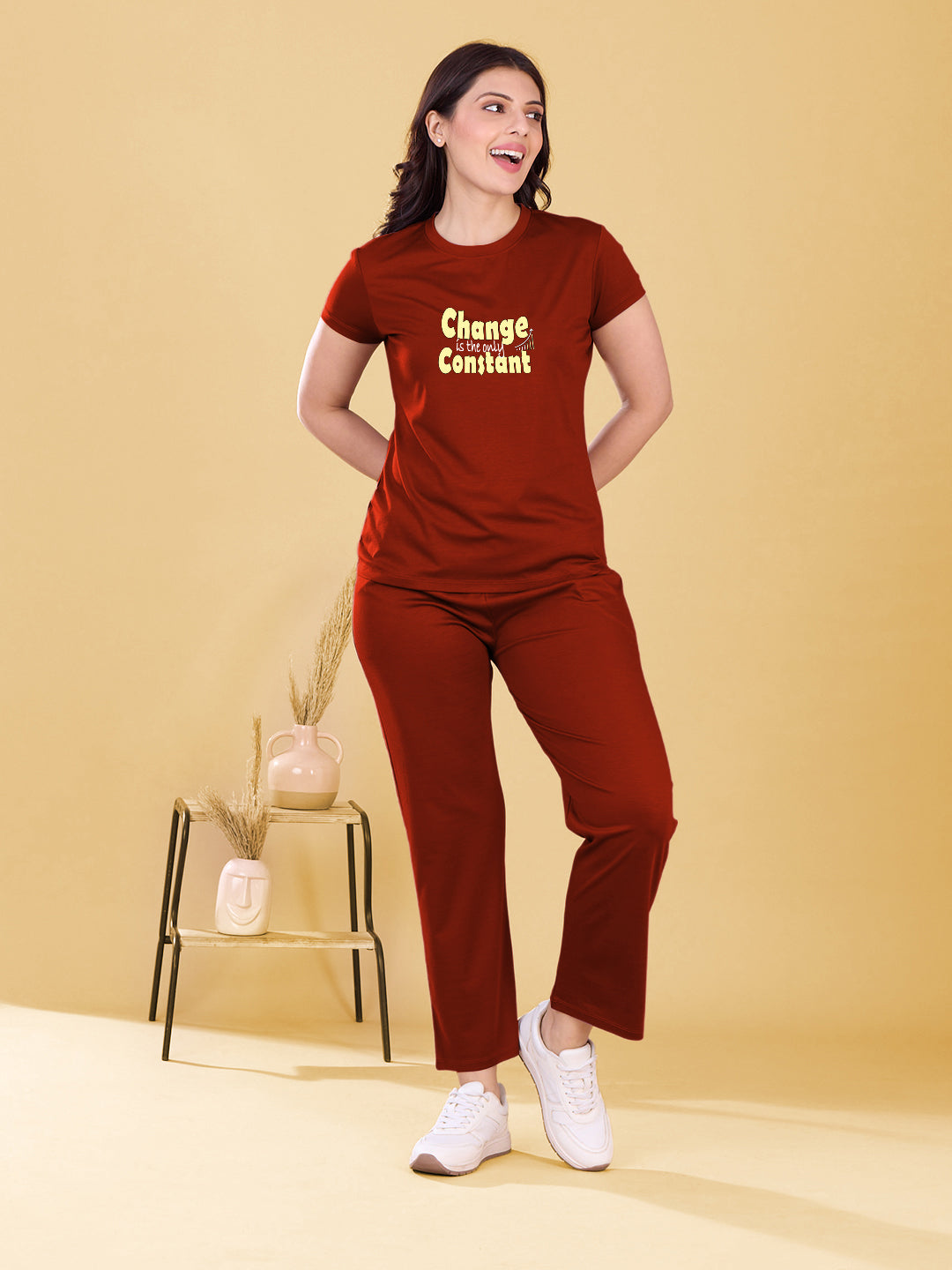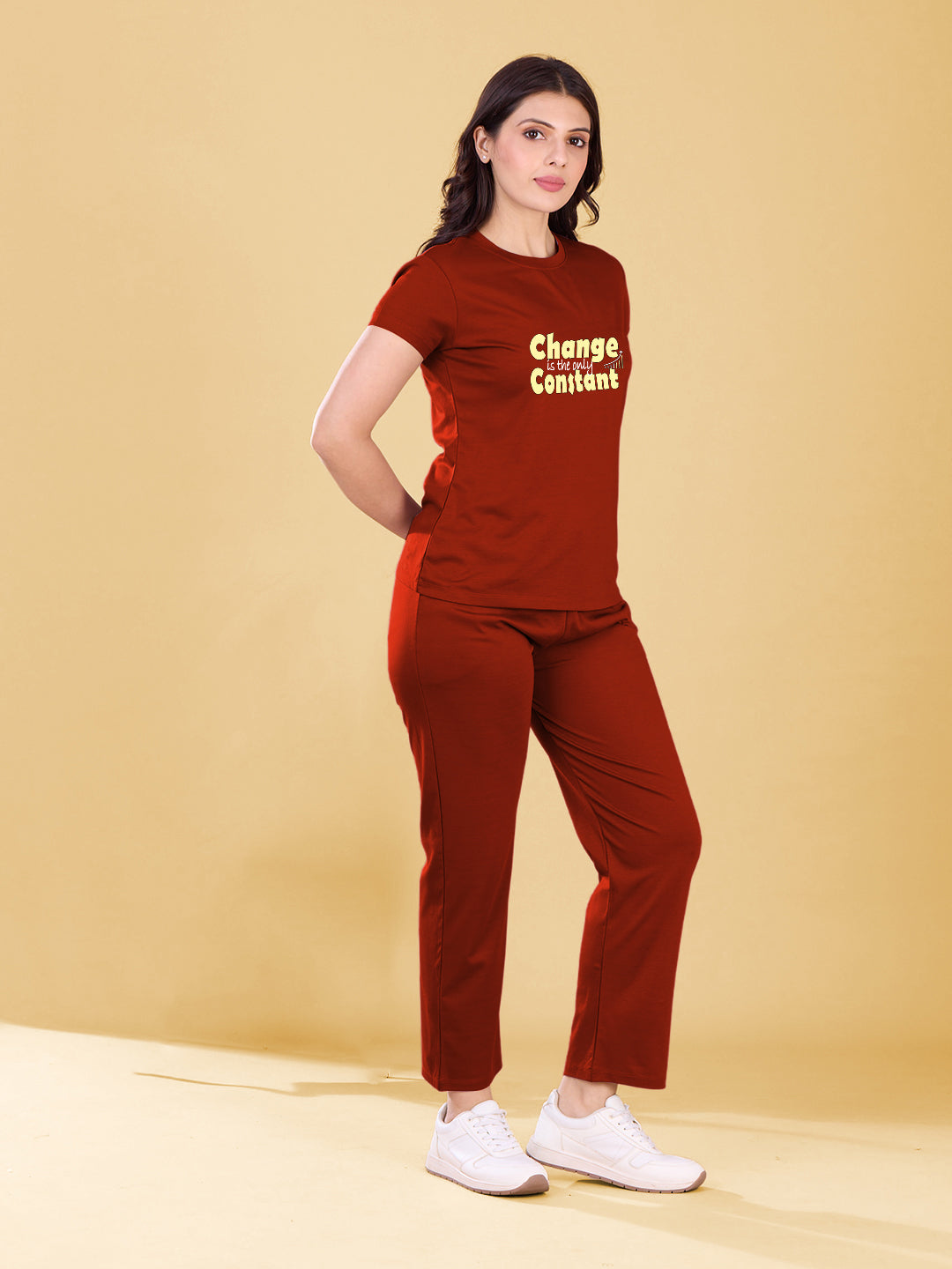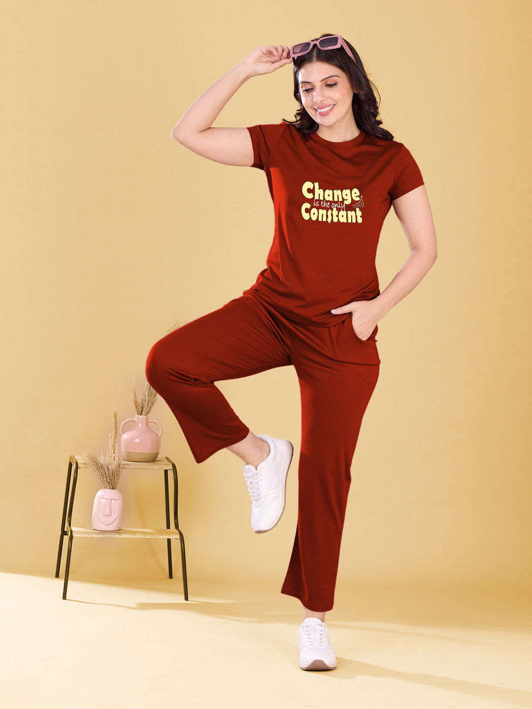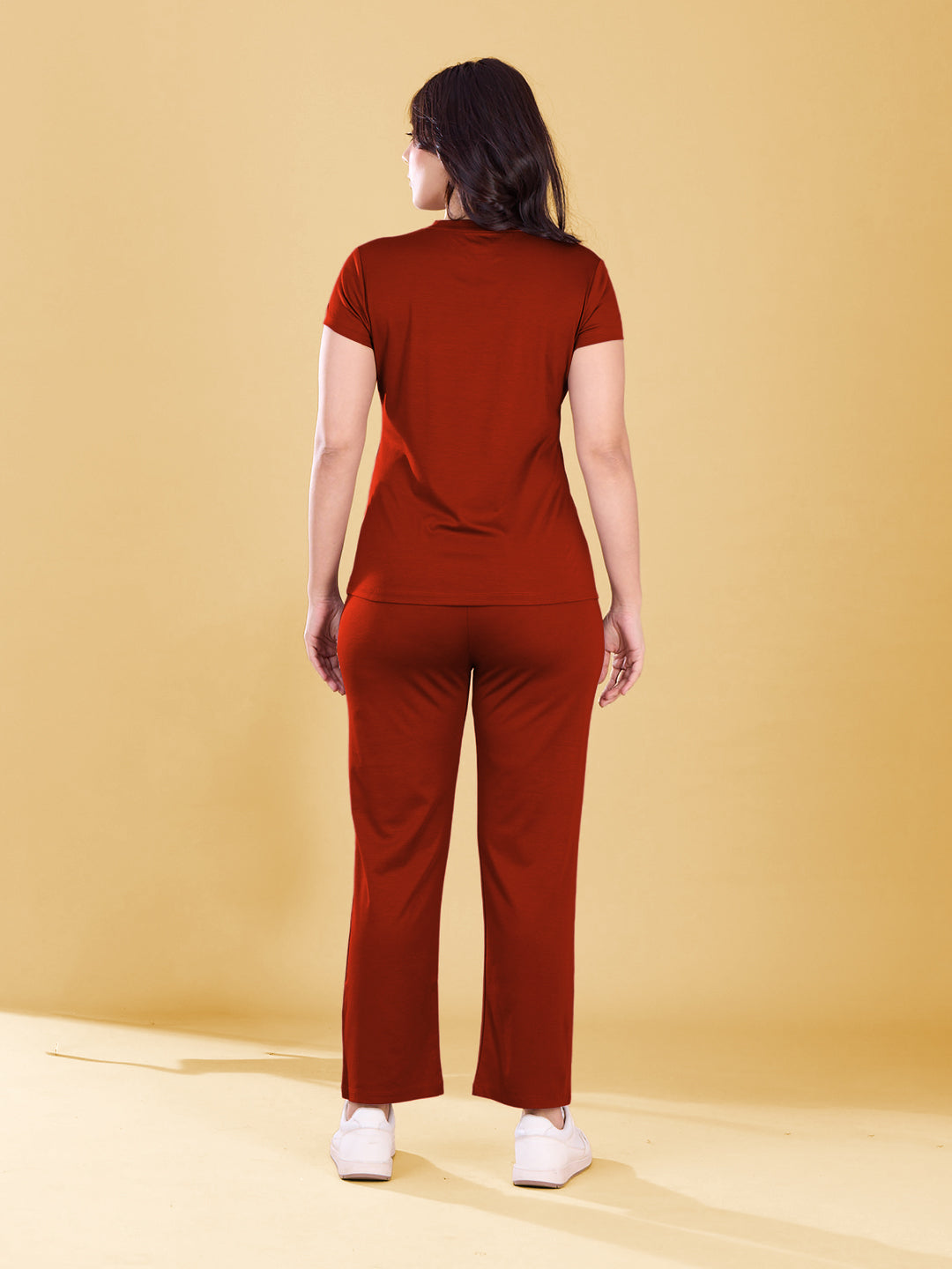 Includes stylish printed T-shirt and mid-rise flare pants for a trendy co-ord look