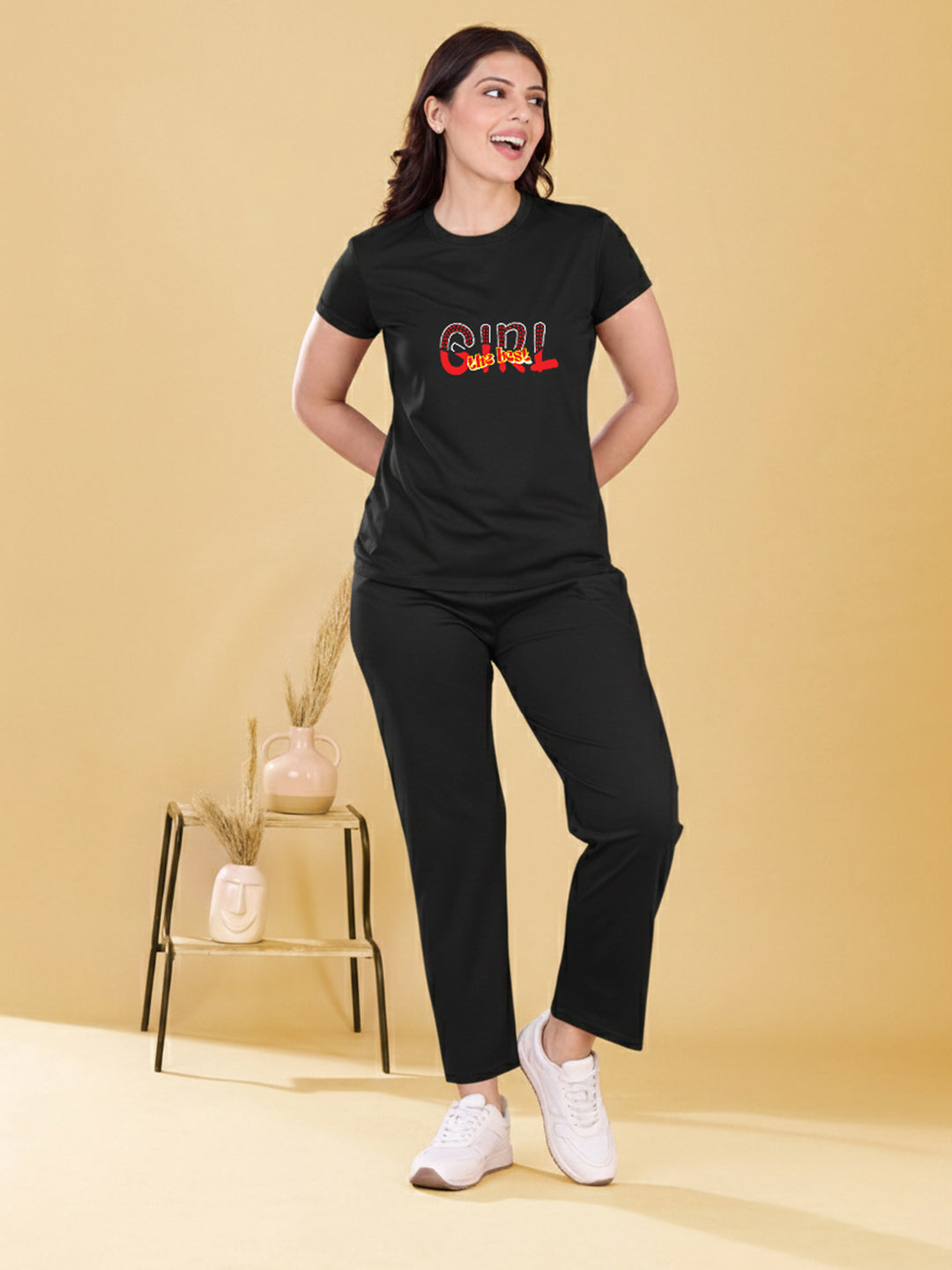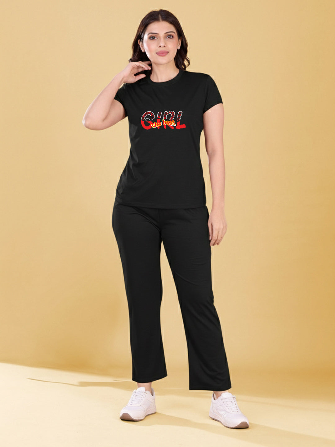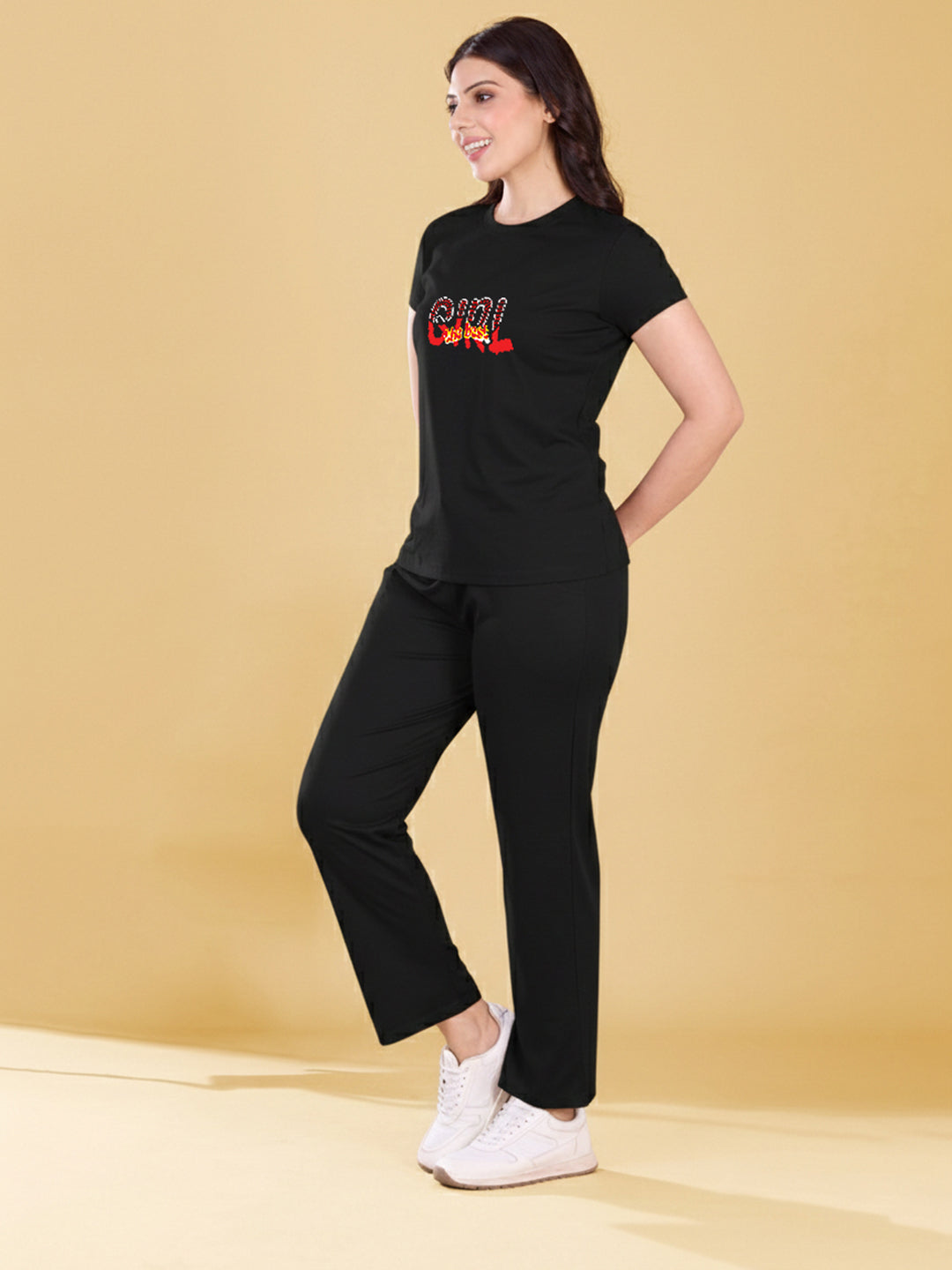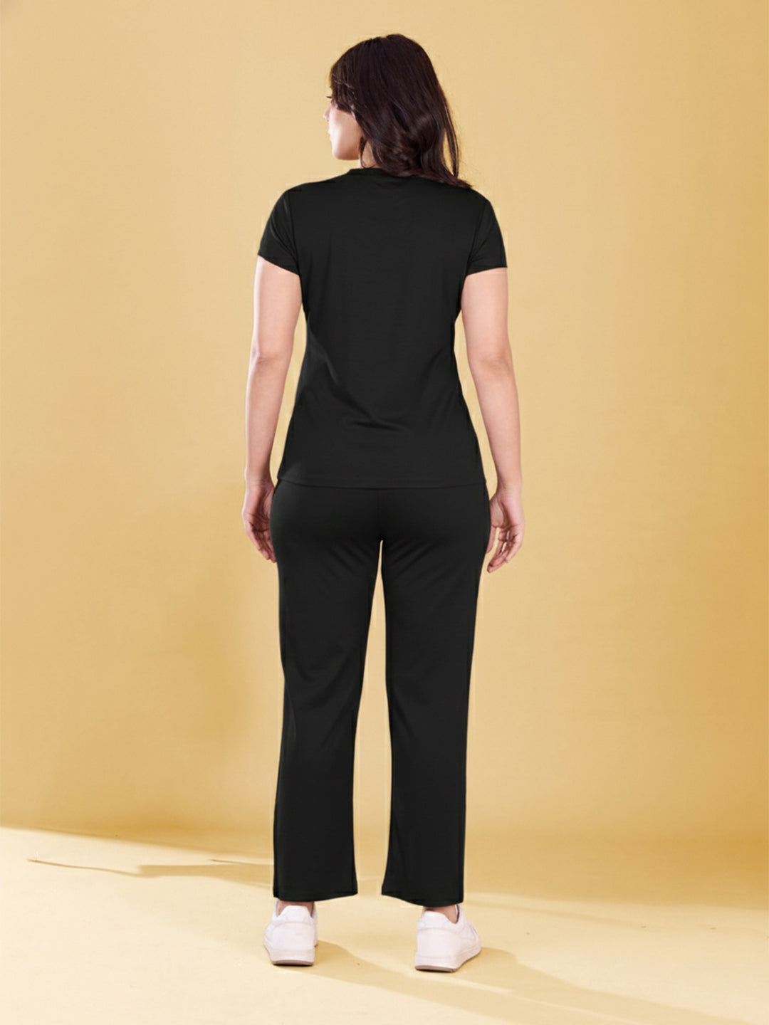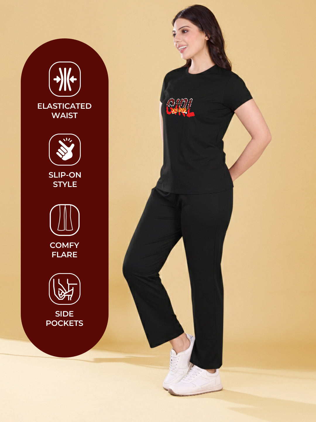 Includes stylish printed T-shirt and mid-rise flare pants for a trendy co-ord look